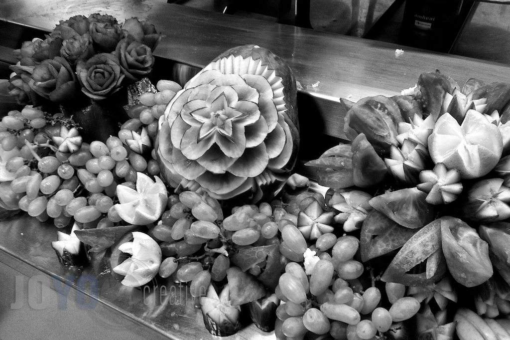 Day 190 -This one might loose a little in black and white, but don’t know I’ll see fancy fruit carvings like this again. No special occasion or anything, just a Thursday night at the galley. -MARCH 14