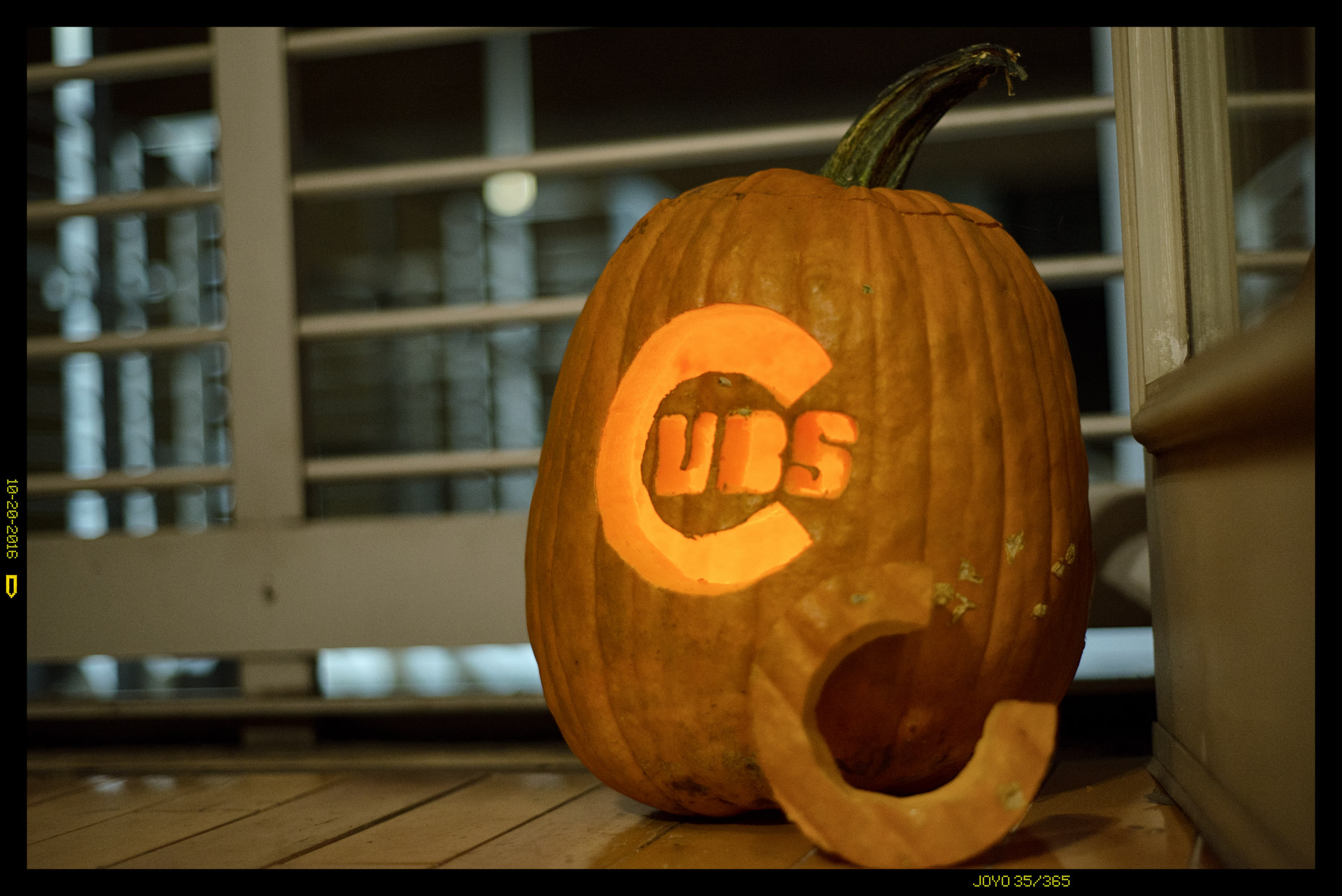 Day 035 -Just as the Cubbies began the game, someone showed up who had been carving pumpkins earlier with a wonderful gift. It looks great in the apartment, and thankful for such a thoughtful gesture. (October 20, 2016)